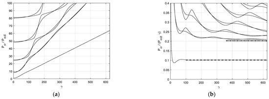 Figure 6. Critical loads for a beam with fixed ends and a hinge at midpoint on Winkler support: (a) dimensionless critical loads versus beam–support stiffness parameter and (b) ratio P c r / ( P c r , E   γ ) versus beam–support stiffness parameter.