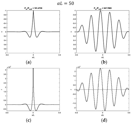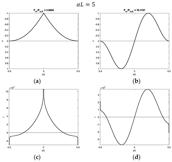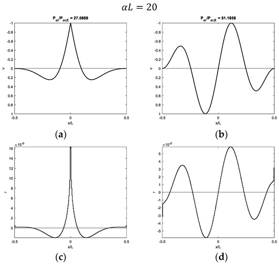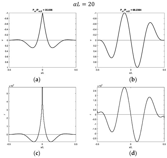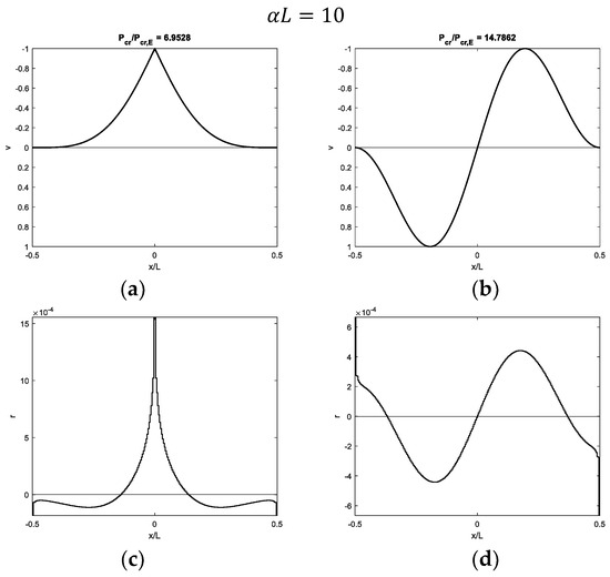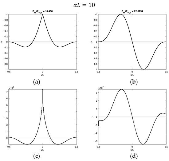 Figure 7, Figure 8, Figure 9 and Figure 10 show modal shapes and contact reactions obtained with four increasing values of α L , highlighting the corresponding increasing dimensionless critical loads. Modal shapes related to the first critical load (Figure 7a, Figure 8a, Figure 9a and Figure 10a) are symmetric and characterized by maximum values at the weak section or joint at the midpoint, with an evident slope inversion due to the presence of the internal hinge. Modal shapes related to the second critical load (Figure 7b, Figure 8b, Figure 9b and Figure 10b) are sinusoidal and asymmetric. Contact reactions (Figure 7c,d, Figure 8c,d, Figure 9c,d and Figure 10c,d) are not fully proportional to the corresponding vertical displacements along the beam length and can assume nonzero values close to the beam ends even if displacements are nil in the case of soft supports (Figure 7c,d, Figure 8d, Figure 9d and Figure 10d).