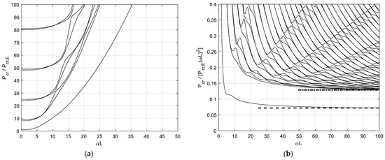 Following the representation already adopted in Figure 11, Figure 15a shows increasing dimensionless critical loads, whereas Figure 15b shows the ratio P c r / [ P c r , E   α L ) 2 versus α L . In this case, the first critical load converges to the following ratio (dashed line):