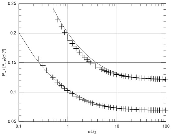 Figure 16. First (non-sinusoidal modal shapes) and second (sinusoidal modal shapes) critical loads. Ratio P c r / [ P c r , E   ( α L ) 2 ] versus α L / χ . Plus symbols represent numerical results; continuous lines represent Equations (21) and (22).