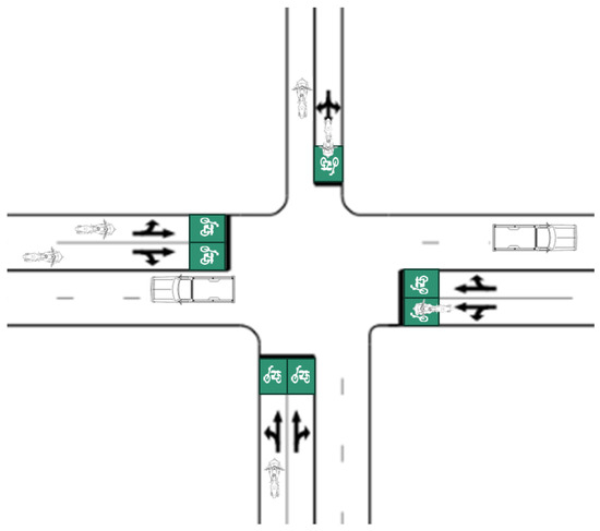 - Lin, Y.; Liu, Y.; Tang, L.; Zheng, S.; Chen, B.; Yang, H. Bicycle Crossing Design and Signal Control Optimization for the Symmetric Intersection. In Proceeding of the 2021 6th International Conference on Transportation Information and Safety (ICTIS), Wuhan, China, 22–24 October 2021; IEEE: New York, NY, USA, 2021; pp. 406–414. [Google Scholar]