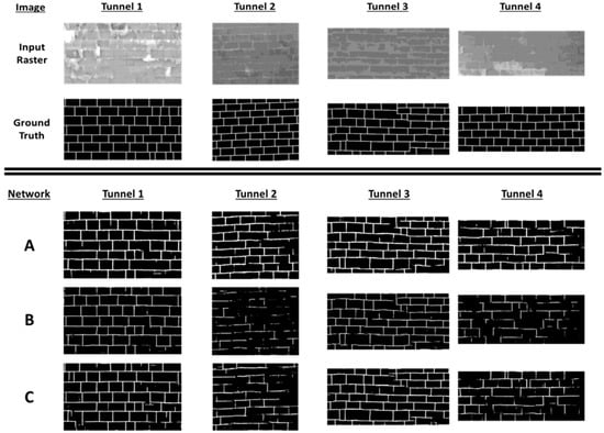 Figure 2. It is clear that Network A had a better generalisation performance than B and C. The overfitting of Network B to Tunnel 1 yielded the best results on the Tunnel 1 test data at the expense of Tunnels 2, 3 and 4’s performances. The performances on Tunnels 2 and 4 were worse than on Tunnel 3. This was likely due to the differences in features between the stone- and brick-lined tunnels. Although the decrease in performance when moving from Network A to B and C is qualitatively visible in