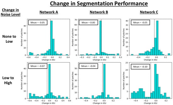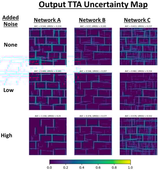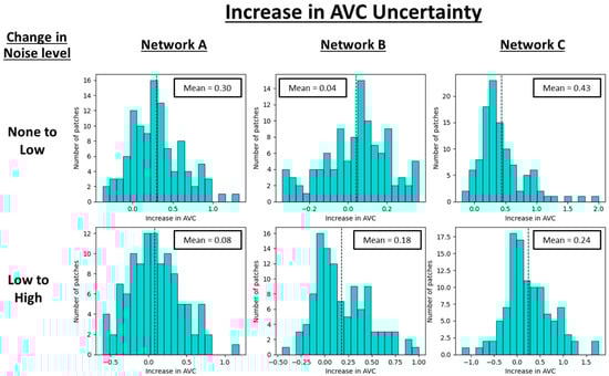 Figure 5 for an image patch with varying levels of added noise in the input image. For Network A, although the AVC increased with increasing noise levels, visually, there appeared to be fewer areas of uncertainty. Inspecting