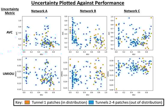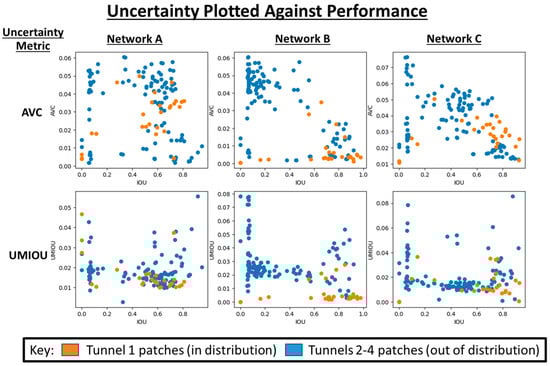 Figure 9. There was a weak negative correlation between the AVC and IOU for Networks B and C; however, it was less pronounced for Network A. This was possibly because Network A generalised better to unseen data than Networks B and C. This would have caused the epistemic uncertainty to have less of a negative performance impact than for Networks B and C. An alternate explanation is that Network A could have captured a broader variety of feature relationships than Networks B and C due its exposure to a wider variety of training data. The more complex relationships were more adversely impacted by applying dropout than the simpler relationships in Networks B and C. This would have led to the MCD generating universally higher levels of uncertainty and suggests that MCD can be used to indicate the generalisability of a trained network. A further analysis covering a wider variety of datasets would need to be conducted to fully separate the impacts of these factors.