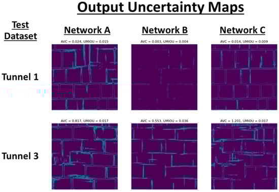 For Network A, the uncertainty maps clearly show the locations where varying segmentations are possible. For example, there was clearly uncertainty in Network A’s segmentation at the top of the Tunnel 1 patch. Observing the regularity of the masonry, it was likely that at this location, masonry cracks were being predicted as joints. For Network B, there was a substantial increase in both the AVC and the level of uncertainty that could be qualitatively observed. The change in the epistemic uncertainty was the most extreme for Network B, as it was overfitted to Tunnel 1. This demonstrates how uncertainty maps can be used to determine which tunnel areas are likely to be within the distribution of the trained model.