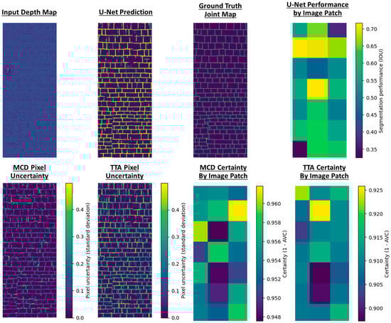 It is necessary to account for areas where there may be a poor segmentation performance despite a low level of uncertainty being identified. These regions are likely caused by abnormalities in the input depth map caused by tunnel features that have not been encountered during training and are challenging to accurately identify from the depth map alone. While many of these cases will lead to epistemic uncertainty, it is possible for the network to be confidently incorrect if a joint is not visible in the depth map. This may occur, for example, if the mortar is level with the masonry surface. In addition, high levels of noise are not always detected by TTA as aleatoric uncertainty if no reasonable segmentations can be generated. As a result, the engineer should conduct further pixelwise segmentation verification in areas they have identified as anomalous during their on-site qualitative inspection of the tunnel.
