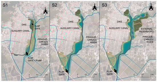 The three simulation scenarios incorporate a polder system to protect the Jardim Maravilha neighborhood, but they fundamentally differ in dike placement, leading to distinct solutions. They are all illustrated in