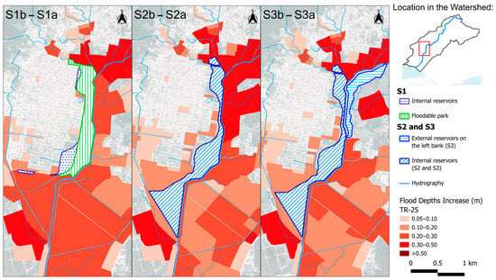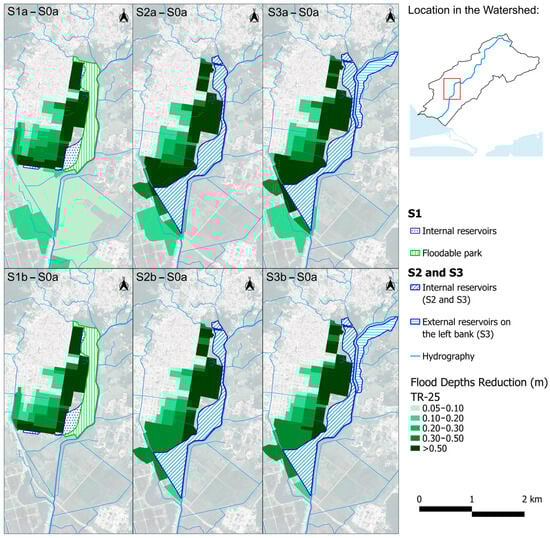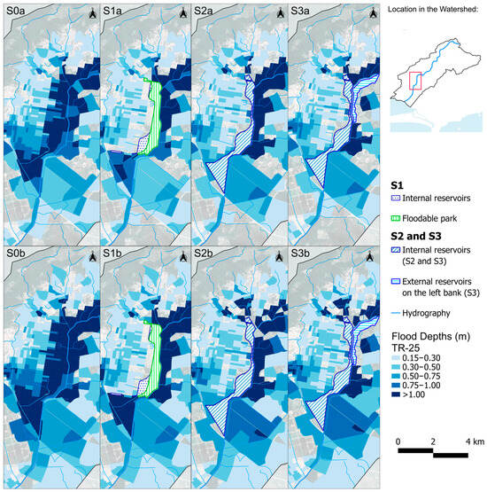 2—is subjected to water depths exceeding 1 m. In contrast, all three project scenarios (S1a, S1b, S2a, S2b, S3a, and S3b), show a substantial decrease in flood depths within urbanized areas, highlighting their effectiveness. Even under stressed climatic conditions (S1b, S2b and S3b), water depths are reduced compared to S0a, demonstrating the long-term efficiency of the projects.