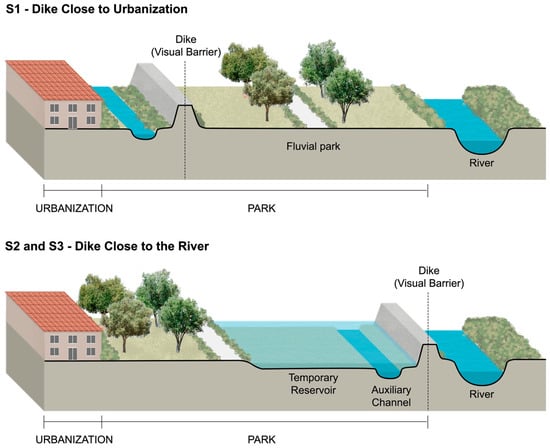 In S1, the dike is positioned close to the urbanized area rather than near the river, greatly preserving the river’s natural functions by maintaining transversal connections to both banks (although limiting the river flooding on the right banks, to protect the Jardim Maravilha neighborhood, settled in low-elevated and mild-slope areas). The left riverbank outside the protecting dike remains natural and can serve as an overflow area during heavy rainfall events. This space also has the potential to function as a fluvial park, benefiting from its connection to the river—even though it remains visually separated from the urban area due to the presence of the dike.