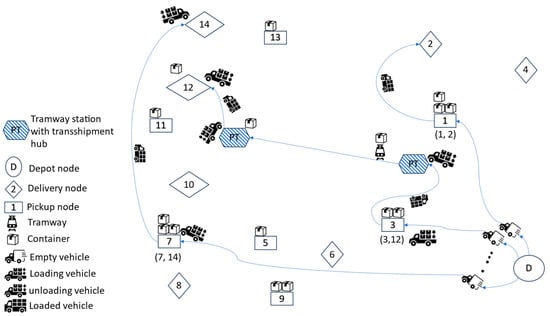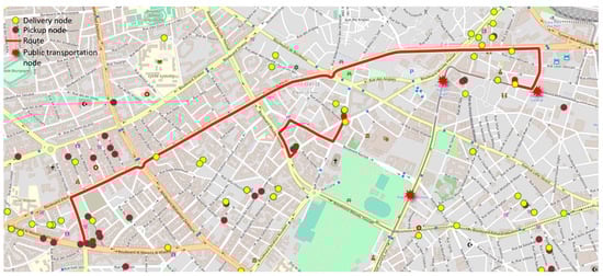 An inspiring variant was presented and researched in a series of studies [,,,] in which the authors extended the classical Pickup and Delivery Problem with Time Windows (PDPTW) by allowing freight requests to be transported via scheduled public transport lines. Transfers were restricted to end-of-line stations to avoid delays and maintain the passenger service quality. This extended model, referred to as PDPTW-SL, demonstrated the potential to reduce the operational costs by shifting selected shipments onto fixed-line vehicles, thereby shortening truck delivery routes. In [], the foundational framework and its inherent complexity were introduced; In [], the authors developed an adaptive large neighborhood search heuristic to solve large-scale instances efficiently. The approach was further enhanced in [] with a scenario-based planning method that incorporated stochastic demands via a sample average approximation scheme. In [], a branch-and-price algorithm was proposed to solve small to mid-sized instances optimally, highlighting the benefits of synchronizing delivery activities with public transport schedules and capacity constraints. Despite these promising contributions, the authors acknowledged limitations in practical implementation, including assumptions of unlimited infrastructure at transfer points and the lack of real-time traffic integration.