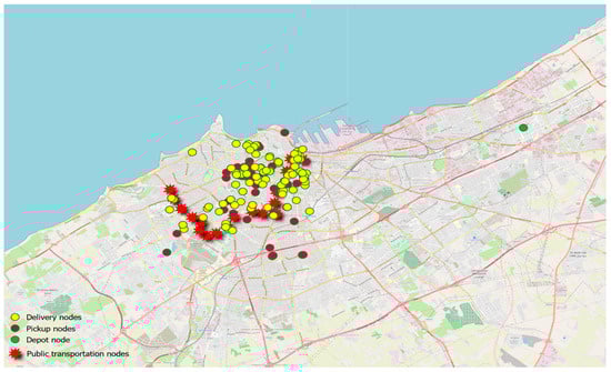 The depot nodes and public transportation nodes were not given any demand in the model, and it was assumed that the depot node was open to all vehicles for the entire 24 h of the day. The trips for public transportation were taken from real-life GTFS data for the tramways of Casablanca, and the time windows for public transportation were set to 20 min before the first trip from the given station to 20 min after the last trip from the last station. By generating random time windows for the pickup and delivery nodes, we could simulate real-world variability and unpredictability, making the model more robust.