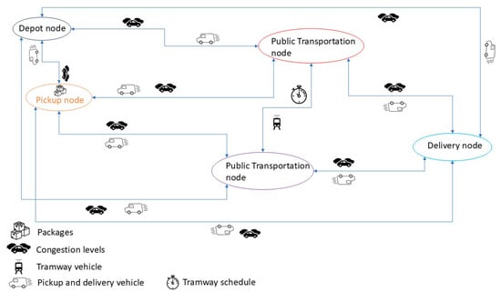 Recent advances in urban logistics have shed light on the increasing integration of freight and passenger transport systems to address the growing complexity of last-mile delivery in congested urban areas. A recent review [] presented the concept of integrated people and freight transport (IPFT) as a promising solution to improve sustainability, efficiency, and cost-effectiveness in city logistics. IPFT enables the shared use of transport infrastructure and vehicles for both passengers and goods, utilizing underused public transport capacity to transport freight and reduce traffic congestion, vehicle emissions, and delivery costs.