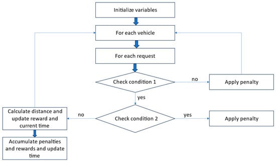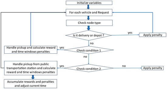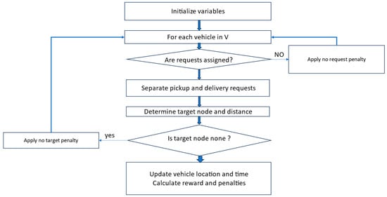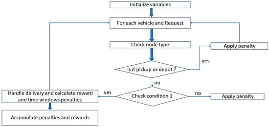 In Figure 9, the flowchart illustrates how, in the delivery action, the vehicles loop through pending requests to verify that they are at the correct delivery node. When a valid delivery occurs, the vehicle’s capacity is updated, and a substantial reward is granted. Again, if a vehicle is located at a pickup node or depot and tries to deliver, a penalty is imposed. This logic ensures that only legitimate deliveries are rewarded, while avoiding inefficient or incorrect actions.