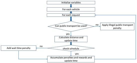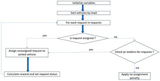 Figure 7 showcases the process of request assignment. It illustrates how the action systematically sorts vehicles by capacity to ensure efficient assignment. If a vehicle can accommodate the request’s size, the request’s status is changed, the vehicle package count is incremented, and a reward is granted to reflect successful allocation. In contrast, failing to assign a request triggers a penalty. The action prioritizes requests either waiting at a pickup node or arriving via a public transport vehicle.