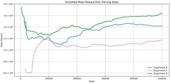 The smoothed mean rewards curves presented in the Figure 12, illustrate the performance of three distinct deep reinforcement learning experiments, corresponding to Experiments A, D, and F. Experiment A, represented by the light blue curve, starts with a high initial reward that dips significantly before gradually recovering and stabilizing at a moderate level. This behavior suggests that the agent initially struggles but eventually adapts and improves its performance over time. Experiment F, depicted by the pink curve, shows the lowest starting rewards early on, with a slower and less robust recovery, as can be seen from the explosive early increase and then the drop in rewards until it recovers. The final reward level remains lower than that of the other experiments, indicating that this approach might lead to less effective learning or instability in the agent’s ability to generalize its policy. Conversely, Experiment D, represented by the green curve, exhibits the most stable and consistent increase in rewards. Starting from a high point, the reward drops but then steadily rises and surpasses those of the other experiments, stabilizing at the highest level. This suggests that the combination of ε-greedy exploration with public transportation as an action allows the agent to explore more effectively and adapt its policy to achieve superior long-term performance. The graph is presented in Figure 12.