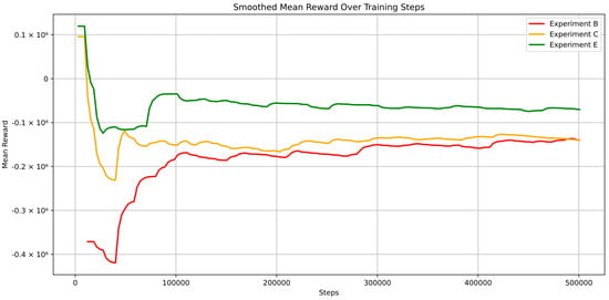 Smoothed Mean episode rewards for experiments without the use of public transportation (data source: TensorBoard).