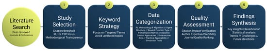 • Keyword Strategy: A targeted keyword strategy was designed to maintain focus on reinforcement learning applications for traffic signal control. Primary search terms included “Reinforcement Learning for Traffic Signal Control”, “RL-based Traffic Light Optimization”, “Adaptive Traffic Signal Control using RL”, “Deep Reinforcement Learning for Traffic Signal Management”, “Reinforcement Learning for Traffic Signal Control”, and “RL-based Adaptive Traffic Management”. Care was given to select phrases closely aligned with signal control tasks, avoiding broader traffic management or routing topics.