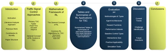 As depicted in Figure 2, this paper is organized as follows: Section 1 introduces the motivation behind this review, outlines the methodology for literature analysis, examines prior research efforts, and highlights the key contributions and novelty of this study. Section 2 provides an overview of RL fundamentals in the context of traffic signal control, discussing general RL-based strategies applied in intelligent transportation systems. Section 3 explores the core RL methodologies used in traffic light signal management, presenting a generalized mathematical framework and categorizing approaches based on value-based, policy-based, and actor-critic algorithms. Section 4 examines the most influential studies on RL-based traffic signal optimization from 2015 to 2025, summarizing their key characteristics and findings in tabular format for comparative analysis. Section 5 provides an in-depth evaluation of RL-based traffic control methods, assessing their effectiveness based on critical key elements, including methodology type, multi-agent integration, reward function, baseline control, performance index, and simulation tools. Section 6 identifies, summarizes, and analyzes the emerging trends and challenges in RL-driven traffic signal control, highlighting also the potential research directions for future advancements in the field. Section 7 concludes the review by summarizing key insights and presenting final reflections on RL’s impact on adaptive and intelligent traffic management. Figure 2 portrays the overall paper structure.