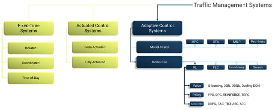 Traffic signal control frameworks play a critical role in managing urban mobility, ensuring safety, and optimizing intersection efficiency. Such traffic management approaches may be broadly classified into three main categories: fixed-time (pre-timed) control, actuated control, and adaptive control, each comprising various subtypes (see Figure 3). More specifically: