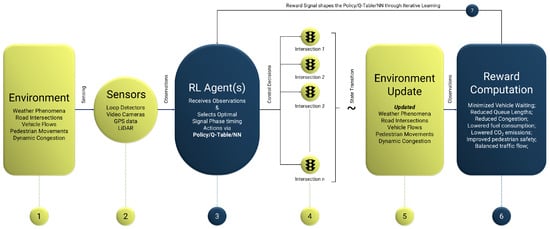 In RL-based traffic signal control, the decision-making process is structured around key components that interact dynamically to optimize traffic flow. The overall operation of RL control within a traffic signal control may be described through the following key steps (see Figure 4):