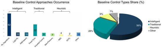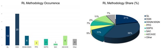 • Data Categorization: Each selected study was carefully classified across multiple dimensions to enable thorough and structured analysis. The categorization included the RL methodology type and specific algorithms employed, the agent structure (single-agent vs. multi-agent control), the nature of the reward function, the performance metrics used for evaluation, and the baseline control strategies adopted for comparison. Furthermore, the scale of the traffic environment—whether single intersections or larger networks—was documented. Finally, the simulation platforms utilized for model training and validation were systematically recorded to assess the realism and comparability of the reported results.