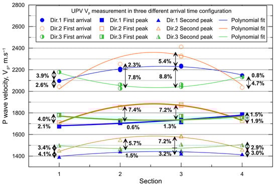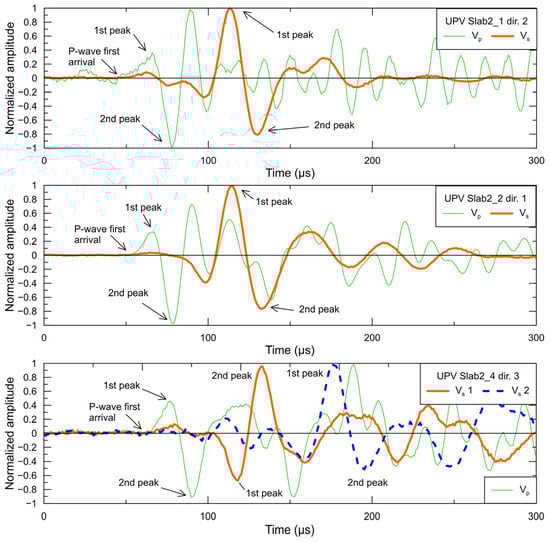 - UPV results with PUNDIT also show anisotropy. UPV Vp values are different in every direction, and the same axial symmetry relative to the middle of the slab was observed as in P-RAT results. Vs values from UPV were trickier to obtain, as the arrival time of the wave is hard to determine. Various setups of arrival time were then tested. Vs from P-RAT and Vp from UPV results are consistent one with each other.
