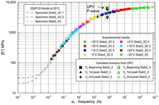 - E* results are consistent in the tested specimens, and they were modelized with the 2S2P1D model. Moduli from UPV were plotted in the master curve and the proper arrival time setup were determined to be the first peak for P-wave.