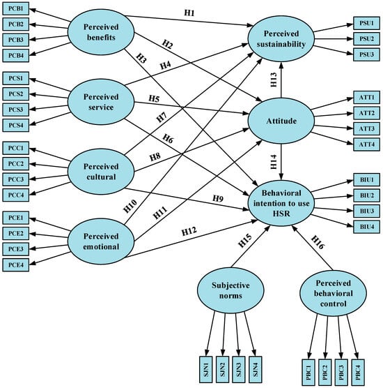 The structural equation modeling (SEM) analysis examined relationships between four exogenous variables (perceived benefits, perceived service, perceived cultural factors, emotional aspects) and three endogenous variables (perceived sustainability, attitude, behavioral intention), plus two moderating variables (subjective norms, perceived behavioral control). The model specified sixteen hypothesized relationships, with direct paths from perceived benefits (H1–H3), perceived service (H4–H6), perceived cultural factors (H7–H9), and emotional aspects (H10–H12) to perceived sustainability, attitude, and behavioral intention. Additional paths linked attitude to perceived sustainability (H13) and behavioral intention (H14), with paths from subjective norms (H15) and perceived behavioral control (H16) to behavioral intention.