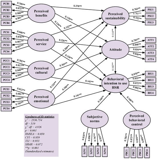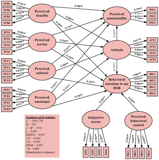 The first set of hypotheses (H1–H3) addresses the impact of perceived benefits on key outcome variables. These hypotheses propose that higher perceived benefits positively influence sustainability perceptions (H1), attitudes (H2), and behavioral intentions (H3) toward the rail service. Similarly, hypotheses H4–H6 examine how perceived service quality affects these same outcome variables, suggesting positive relationships with sustainability perceptions (H4), attitudes (H5), and behavioral intentions (H6).