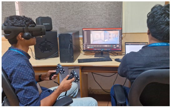 The pilot study examined how portable neuroelectrical tools, such as the Emotiv 5-channel EEG headset, can be used during immersive VR walkthroughs of six conceptual room designs. This approach is in line with the framework’s objective of supporting evidence-based refinements in Stage-3, by using human validated experiential data to inform design decisions in BIM. This pilot’s findings are the first step towards integrating human experience more systematically into architectural workflows, closing the gap between creative ideation and experiential validation in real-time digital environments. The EEG signals were acquired with the Emotiv 5-channel headset which has a sampling rate of 128 Hz and has five electrodes (Anterior F3, T7, Pz, T8 and Anterior F4). Signal acquisition was performed through EmotivPRO standard software, which gave raw time-series data for each of the five electrodes. Electrode impedance was checked before recording to ensure data quality, and only sessions with satisfactory contact quality were included in the analysis. Each participant’s session involved six 1 min EEG recordings, one per virtual room. The raw EEG data were examined visually and filtered using a 0.5–30 Hz band pass filter to eliminate high frequency noise and low frequency drift. Emotiv’s “EmotivPRO standard” EEG software measures brainwave activity as band power in microvolts squared (µV