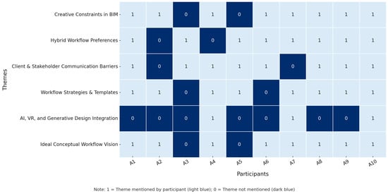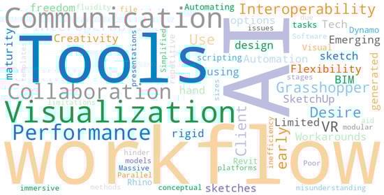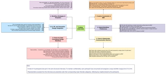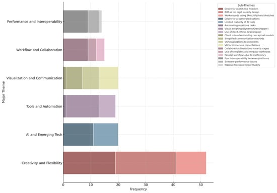 Figure 12, under the theme Creativity and Flexibility, sub-themes such as Desire for sketch-like freedom, BIM as too rigid in early design, and Workarounds using SketchUp/hand sketches were identified as significant concerns, with high mention frequencies. Similarly, sub-themes like Desire for AI-generated options and Limited maturity of AI tools were mapped under AI and Emerging Tech, indicating participants’ interest in integrating emerging technologies in BIM workflows. Other prominent sub-themes such as Use of templates and modular workflows and Parallel workflows due to inefficiency were grouped under Workflow and Collaboration, while challenges like Client misunderstanding conceptual models and Simplified communication methods were categorized under Visualization and Communication. Additionally, interoperability and software performance issues were captured under Performance and Interoperability. Charting these sub-themes against their respective major themes provided a visual hierarchy of the participants’ responses and highlighted the concentration of challenges and opportunities associated with using BIM during the conceptual design phase. This structured representation enabled a deeper analysis of patterns, overlaps, and unique insights shared by the interviewees, thereby strengthening the thematic framework for further interpretation.