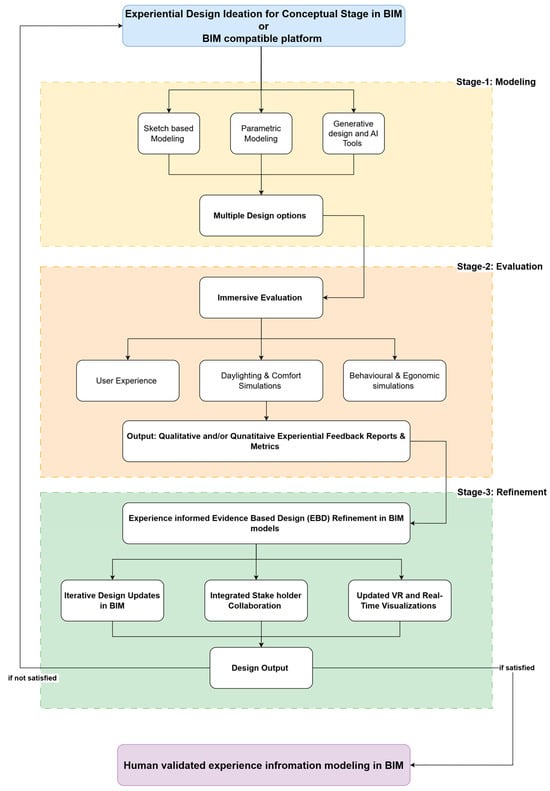 Stage-1: Experiential Design Ideation responds to the creative constraints in traditional BIM environments by integrating sketch-based modeling, parametric tools, and AI-driven generative design platforms. This stage promotes flexible and iterative exploration of spatial concepts, accommodating emerging WebBIM and openBIM workflows that support interoperability and early-stage design experimentation.