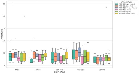 Figure 16 illustrates the distribution of EEG frequency bands recorded from participants across six VR galleries, each with distinct spatial patterns. The analysis revealed observable differences in neural activity across environments, suggesting varied cognitive and emotional responses. In the boxplot, the central box represents the interquartile range (IQR), encompassing the middle 50% of the data (Q1 to Q3), with the horizontal line denoting the median. Whiskers extend to data points within 1.5 × IQR from the quartiles, while values beyond this range are treated as statistical outliers. In this study, diamond-shaped markers represent EEG amplitude outliers across specific brainwave bands (Theta, Alpha, etc.) under six distinct VR room conditions, indicating instances of elevated or suppressed neural activity outside the normative range.