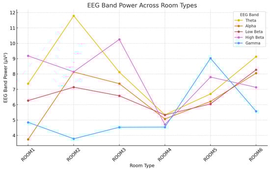 To interpret these patterns, EEG power band values were plotted for each room type (