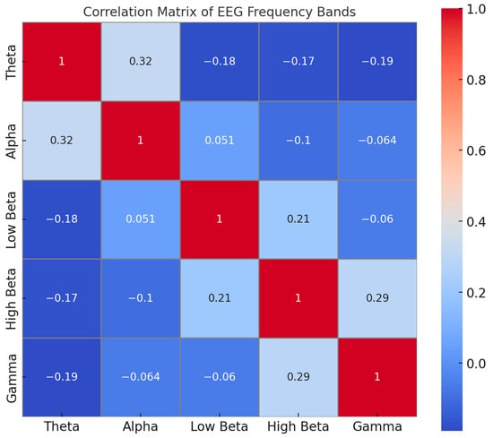 154]. Additionally, positive correlations between Low Beta and High Beta (r = 0.21) and between High Beta and Gamma (r = 0.29) were observed, suggesting that these fast-frequency bands are jointly activated during tasks requiring heightened attentional control, sensory integration, and executive processing [