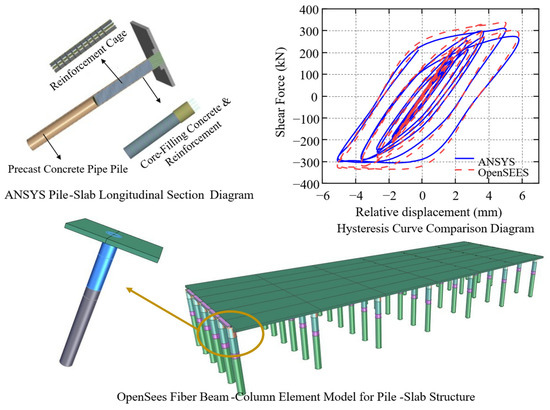 Our team successively employed ANSYS and OpenSees to conduct simulations on the pile–slab structure designed in this study and performed comparative analysis by applying cyclic loading in the form of horizontal displacement, as shown in Figure 2. Simulated vertical loads from the superstructure were applied to the beam ends of the pile–slab structure, and horizontal displacement loads were imposed on control points for regulation. The displacement levels were set at 1/800, 1/500, and 1/250, with six cycles at each level; at 1/150, four cycles; and at 1/100 and 1/80, with two cycles per level. As shown in Figure 1, the shapes and trends of the hysteresis curves from the two simulations are consistent, with the maximum difference in hysteresis loop area being 0.55%, all less than 1%. The results indicate that the curve fitting between the two is highly accurate, thus validating the reliability of the nonlinear analysis model for pile–slab structures based on OpenSees.