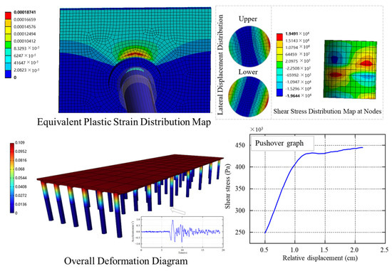 Utilizing the Pushover analysis method, a maximum lateral linear displacement of 5 cm was applied to the pile–slab structure within 10 s. The resulting equivalent stress contour and plastic strain diagrams are shown in the Figure 3. The relative displacement was obtained by calculating the difference in displacements between the top and bottom surfaces of the nodes. A Pushover curve for the nodes was plotted with relative displacement (m) on the x-axis and shear force (kN) under lateral pushing on the y-axis, as shown in the figure below. Referring to the Code for Seismic Design of Buildings (GB50011-2010) [42], which specifies a limit of 1/30 for the elasto-plastic inter-story drift angle of reinforced concrete frame structures to determine whether the structure has reached a critical state of failure under seismic action, this study sets the top displacement angle of the pier beam, Rμ, as the damage indicator. The damage states of the pile–slab bridge structure under different pier top displacement angle thresholds were determined to provide clear quantitative standards for seismic design and reliability assessment of the structure. I. No-damage state: When the pier top displacement angle is less than 1.0%, the nodes and pipe piles of the pile–slab structure remain in the elastic stage, with no visible cracks in the concrete. The prestressed steel bars and steel fiber-reinforced concrete work well together, and the overall stiffness does not significantly degrade, indicating that the structure remains functional and does not require repair under rare earthquakes. II. When the displacement angle reaches 2.0%, the steel fiber-reinforced concrete in the nodes locally enters the plastic stage due to vibration, with microcracks appearing. However, the outer steel casing and prestressed steel bars still provide effective restraint, and the residual deformation can self-recover. The structural function is essentially intact, and the damage can be restored through local repair. III. Moderate-damage state: After the displacement angle exceeds 3.3%, the core concrete in the nodes cracks and extends, the steel casing undergoes local buckling, and part of the prestressed steel bars yield, with the hysteresis curve showing a significant pinching effect. IV. Severe-damage initiation state: When the displacement angle reaches 4.0%, the plastic hinges in the pile–slab connection nodes are fully formed, the steel fiber-reinforced concrete is crushed and spalls off, the outer steel casing deforms significantly, the structural stiffness drops sharply, and the repair cost is high and technically complex. V. Collapse-warning state: After the displacement angle exceeds 7.0%, the pile–slab structure as a whole forms a mechanism, with the bottom of the pipe piles breaking, the prestressed steel bars breaking, and the core concrete completely failing, resulting in the loss of load-bearing capacity.