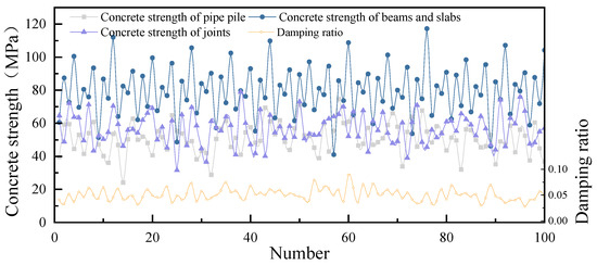 In order to investigate the dynamic response characteristics of pile–plate random structures under strong earthquake loads while considering both the accuracy and speed of calculations, a finite element model of the structure was established using fiber beam elements in the OpenSees finite element platform. During modeling, the complex, nonlinear mechanical behavior of concrete under stress was considered, and the Concrete01 concrete stochastic constitutive model in the OpenSees material library was selected. The Steel02 steel constitutive model was used to consider Bauschinger effect and material hardening issues for steel bars under stress. Four structural parameters, including the compressive strength of pipe-pile concrete, beam–plate concrete, and joint concrete and the damping ratio ζ of the structure, were selected as basic random variables, and their mean values and coefficients of variation were determined. The node-filled core concrete was made of vibratory-mixed steel fiber concrete with a matrix strength of CF40 and a steel fiber volume rate of 2%. Based on the test data and statistical analysis data, the mean value of its cubic compressive standard strength was determined to be 56.5 MPa, and this random variable conformed to a normal distribution with a coefficient of variation of 0.15. The statistical information and distribution types of the above random variables are shown in Table 1 and Figure 4, and all variables were assumed to be statistically independent.