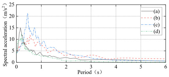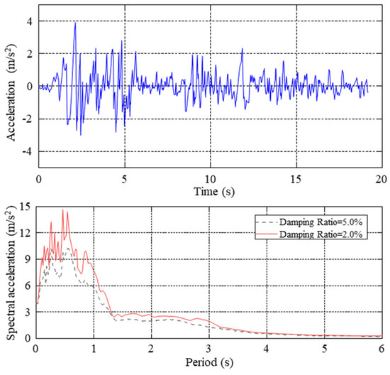 In order to obtain the complete probability density evolution information of pile–plate structures under seismic action, the response of the pile–plate structure under strong earthquake action was analyzed, and the improvement of the seismic reliability of the pile–plate structure by self-resetting nodes was explored. After generating all pile–plate structure samples using the GF bias method, El-Centro earthquake waves with the same type II site as the pile–plate structure were used, and the acceleration modulation value was increased to 0.4 g, inputting them simultaneously along the transverse and longitudinal directions of the pile–plate structure. The acceleration time history of earthquake motion and the corresponding response spectrum are shown in Figure 6.