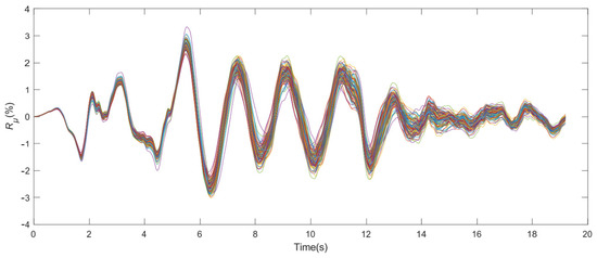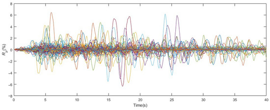 To conduct comparative analysis, the fiber beam element model of the pile–plate structure described in the previous section was adopted, and the analysis was conducted under consistent working conditions. In this study, 100 random samples were selected for analysis, but the basic random variables of the structure became eight-dimensional, including four structural random parameters: the compressive strength of concrete for the pile, beam, and slab, the compressive strength of concrete for nodes, and the structural damping ratio; the other four were random seismic physical model parameters. By using the GF bias sampling method, the pile–plate structure was obtained under the compound effect of random structural parameters and random seismic excitation. The seismic motion amplitude obtained was adjusted to 0.4 g. Deterministic dynamic response analysis was performed on 100 samples, and the Rμ time history curve obtained is shown in Figure 18. It can be seen that under the case of considering the compound effect of parameters and excitation randomness, the structural response still exhibits a high degree of randomness under earthquake excitation, and as time progresses, some samples produce irrecoverable residual deformation, and the structural response exceeds the displacement response under a single random factor. This indicates that when considering the compound effect of multiple random factors, the original randomness is amplified, the seismic response of the pile–plate structure is significantly enhanced, and substantial randomness accompanies it.