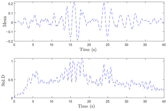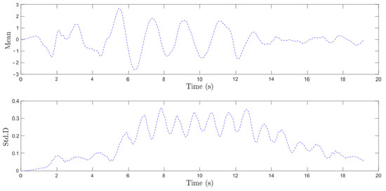 Starting from the perspective of deformation angles, the displacement angles of edge-span beams and columns of pile–plate structures are selected to analyze the stochastic evolution process of the structure. Considering these factors, such as the study’s objectives, available computational resources, and the desired level of result confidence, 100 seismic response analyses were performed on the generated random structural samples, and the time history curve of Rμ, which represents the displacement angle of the top of edge-span beams and columns of pile–plate structures, as shown in Figure 7. According to Figure 7, due to the stochasticity of structural parameters, under the same seismic action, the structural responses of pile–plate structures also exhibit randomness, manifested as fluctuations within the limit range of −3% to 3% for Rμ. The obtained structural response information was combined with given probabilities to calculate the statistical mean and standard deviation of structural Rμ responses, as shown in Figure 8. It can be seen that due to the influence of the stochasticity of structural parameters, the seismic response of the structure has variability, further illustrating the importance of considering the stochasticity of structural parameters in seismic response analysis of pile–plate structures.