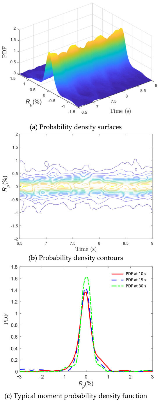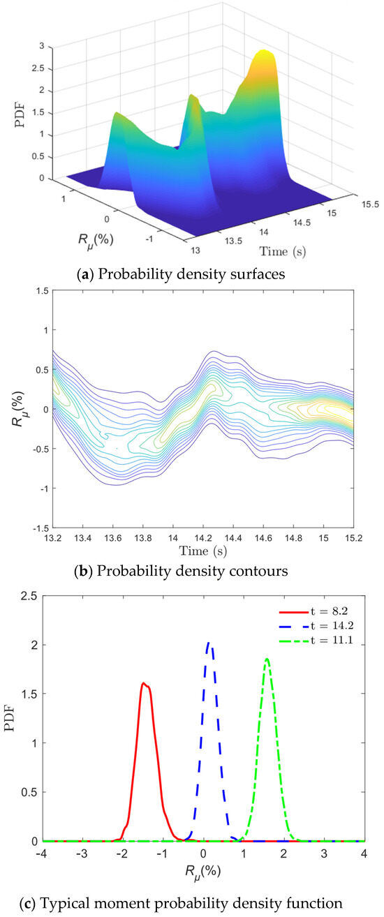 By using the TVD differencing algorithm, joint Equations (1) and (2) were used to solve the probability density evolution equation of Rμ for the pile–plate structure. Based on the results obtained from the probability density evolution equation, surface plots, contour plots, and probability density function curves of Rμ for typical time periods were drawn, as shown in Figure 9. The undulations of the surface plot in Figure 9a reflect the evolution of the probability density function of the displacement angle of the pile–plate structure with time, while the range of displacement angle also evolves with the loading process of earthquake. The probability density contour map of Rμ, i.e., the contour plot of probability density in Figure 9b, provides a more intuitive representation of the random fluctuations of Rμ over time. By analyzing the probabilistic information on the structural response under seismic action, we can better understand and grasp the variation rule of the displacement angle at the top of the pier over time, which lays the foundation for the reliability analysis of the pile–plate structure. At t = 8.2 s, 11.1 s, and 14.1 s in Figure 9c, the probability density function curves of Rμ are selected, and the differences among the three curves indicate that the range and probability density function of Rμ have also been constantly changing over time under the same seismic action.