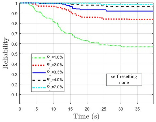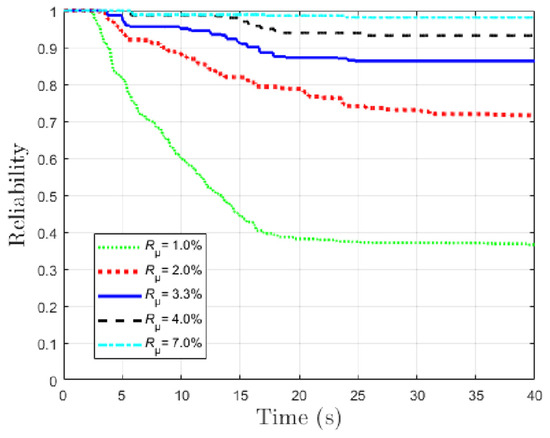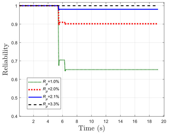 After obtaining the probability density information of Rμ of pile–plate random structure under seismic action, based on the first-exceeding failure criterion and by absorbing boundary conditions of different failure thresholds, the seismic reliability of a pile–plate random structure is calculated, as shown in Table 2. The variation curves of earthquake-proof reliability of pile–plate structure with different thresholds over time are shown in Figure 10.