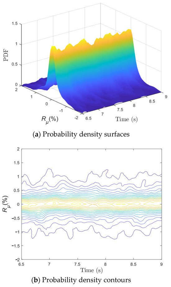 The probability density information of Rμ obtained using the probability density evolution method is shown in Figure 16. Comparing the probability information related to Rμ under the compound random effect and the single random effect (Figure 9, Figure 15 and Figure 19), it can be seen that under the compound random effect, the iso-density lines of Rμ are more irregular, and the probability density information is also more abundant. The differences in the probability density functions obtained under the three random factor conditions indicate the huge variability of the seismic response of the pile–plate structure under a compound random effect. This is due to the fact that when considering the compound effect of parameters and excitation randomness, the multi-mode and multi-modal features of the structure amplify the combined effect of structural randomness, seismic excitation randomness, and material nonlinearity, which enhances the stochastic evolution effect of the seismic response of the pile–plate structure.