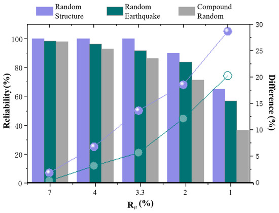 The comparison of the seismic reliability of the pile–plate structure under compound randomness and single randomness is shown in Figure 21. The point-line chart shows the differences in reliability between single stochasticity and compound stochasticity at different thresholds. The seismic reliability of pile–slab structures shows significant differences under the influence of various stochastic factors. When the failure threshold is 3.3%, the seismic reliability considering only the stochasticity of structural parameters is 100%, while considering only the stochasticity of seismic excitation reduces it to 92.01%, and under combined stochasticity, it further decreases to 86.38%. This indicates that the influence of material parameter stochasticity on the seismic reliability of pile–slab bridge structures is less than that of seismic excitation stochasticity. Further comparison between the effects of combined stochasticity and single seismic excitation stochasticity shows that when the failure threshold is relatively high (7.0%), the seismic reliability values are 98.18% and 98.49%, respectively, with a difference of only 0.31%. As the threshold decreases, the difference gradually increases, reaching 3.14% at a 4.0% threshold and 5.63% at a 3.3% threshold. When the threshold is reduced to 2.0% and 1.0%, the differences are 12.09% and 20.2%, respectively.