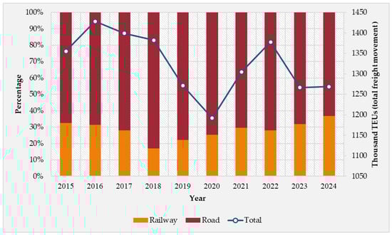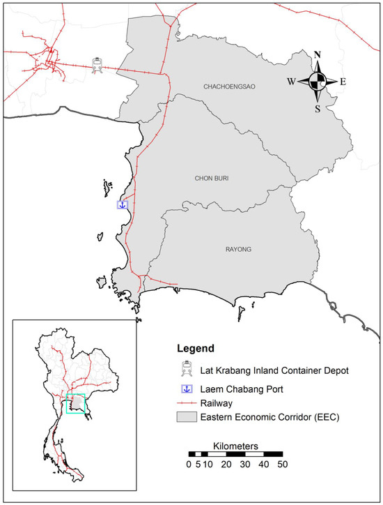 Thailand’s freight transportation system has undergone significant transformation in recent decades, driven by the country’s export-oriented economic growth and increasing integration into global supply chains. Containerized shipping has emerged as a critical component of this system, offering the standardized, efficient transportation of goods between inland production centers and international markets [1]. As shown in Figure 1, the modal distribution of freight transportation in the Lat Krabang ICD–Laem Chabang Port corridor has evolved significantly in recent years. While the long-term average shows rail transport accounting for approximately 28% of total freight movement, this figure is influenced by anomalous conditions during 2018 and 2019 that temporarily depressed rail utilization. The current modal split has improved substantially, with rail now capturing approximately 40% of container movements in the corridor. This positive trend demonstrates increasing shipper acceptance of rail transport and reflects recent infrastructure improvements and operational enhancements in the rail system. Despite this progress, road transport continues to handle the majority of freight in this vital economic corridor, indicating further opportunities for modal optimization [2]. This imbalance represents both a challenge and an opportunity for Thailand’s logistics sector. The Eastern Economic Corridor (EEC) development, Thailand’s flagship economic zone, has further intensified the importance of efficient container transport systems connecting industrial centers to seaports [3,4] (Figure 2). Despite significant investments in transportation infrastructure, Thailand continues to face logistical challenges as freight volumes grow [4]. This growth mirrors global trends where freight shipments have significantly increased due to economic expansion, creating complex supply chains that raise both emission and energy intensity concerns [5]. For Thailand, with its strategic position in Southeast Asia, optimizing container transport efficiency represents not only an economic imperative but also an environmental necessity as the country seeks to balance logistics performance with sustainability goals [6,7].