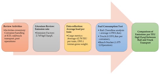 The analytical process begins with a detailed review of all activities involved in container transport operations, including container handling at the ICD, rail/truck transport, and port operations. This activity inventory establishes the system boundaries for the emission assessment and ensures that all relevant processes are captured in the analysis. This approach is consistent with the methodology employed by Fridell et al. [19] and Ahn et al. [27], who emphasized the importance of including all operational components when calculating emissions for freight transportation.