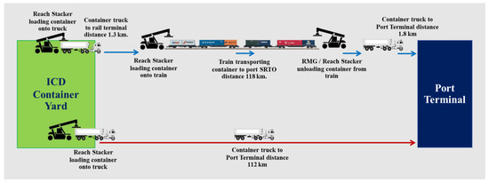 For the rail transport pathway, activities begin at the Lat Krabang ICD container yard with the loading of containers onto trains using reach stacker equipment. Each container-loading operation represents a discrete activity with specific fuel consumption and emission characteristics. Once loaded, the train transports containers along the 118 km rail corridor to the SRTO (Single Rail Transfer Operator) area at Laem Chabang Port [33]. Upon arrival, containers are unloaded from the train using either Rail Mounted Gantry (RMG) cranes or reach stackers, depending on the terminal configuration. The final leg involves transporting containers by truck from the rail terminal to the port terminal over a distance of approximately 1.8 km.
