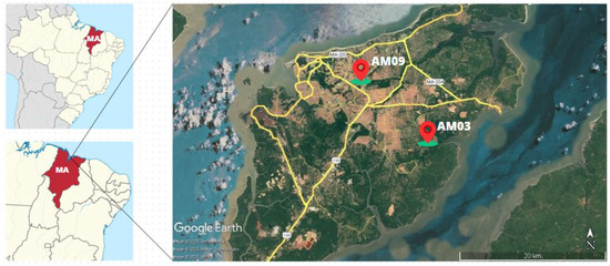 This research investigated two fine soil samples from different areas of São Luís and its surroundings. The selection of sampling points was based on tactile-visual analysis, prioritizing soils with lateritic characteristics. The disturbed samples were collected according to the NBR 9604 standard [33], which establishes guidelines for the opening of inspection pits and trenches, ensuring the proper collection of disturbed and undisturbed samples. Figure 2 shows the location of the sampling points for the studied samples.