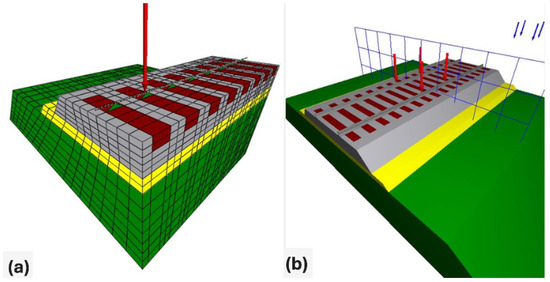 Figure 6a shows the three-dimensional finite element mesh used in the simulations, designed to reflect the transverse symmetry between the rails. This approach is essential for the accurate modeling of soil behavior under the characteristic loads of railway systems. Figure 6b illustrates the railway pavement, highlighting the distribution of loads applied by wagons with 32.5 t/axle, a typical scenario in heavy-haul railways, where the strength and deformation capacity of the subballast are constantly challenged.